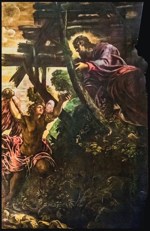 [1] Benezit Dictionary of Artists: Jacopo Robusti Tintoretto was the son of the Venetian dyer Battisto Robusti, from whom he got his appellation ‘Tintoretto’ or ‘little dyer’. He was known for his quick, abbreviated style and dramatic compositions. Though he never achieved great wealth, he enjoyed a long and productive career in Venice, employing several of his eight children in his studio… The following year he completed St Roch Healing the Plague Victims (1549) for the Scuola Grande di San Rocco. These works demonstrate Tintoretto’s use of full-body gestures and dramatic chiaroscuro lighting as storytelling devices, and they mark his entry into more prestigious social circles…. The canvases demonstrate Tintoretto’s renewed interest in unusual and dramatic compositional spaces. The curious use of light, space and colour convey an insubstantial and visionary atmosphere—a quality that he continued to explore in his cycle for the Scuola di San Rocco. See: https://doi.org/10.1093/benz/9780199773787.article.B00183123.