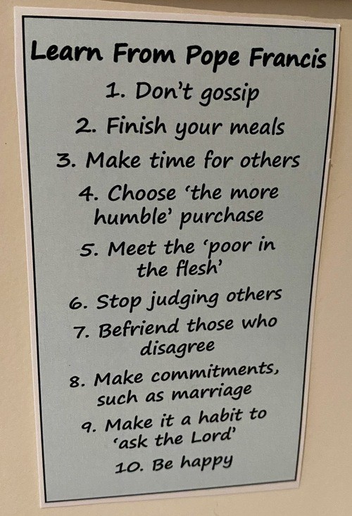 SETTING A TASK FOR WEEK ONE – Consider this from Pope Francis that describes the logic of the Kingdom of God. I found this “Summons” taped to the wall next to the work desk of my sister-in-law, Leslie: