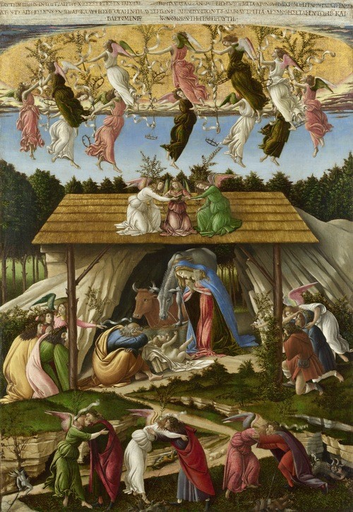 2 To study this painting more closely: https://commons.wikimedia.org/wiki/File:Mystic_Nativity,_Sandro_Botticelli.jpg.