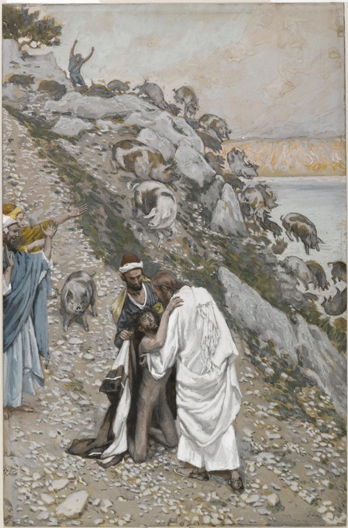 James Tissot (French, 1836-1902), The Swine Driven into the Sea (Les porcs précipités dans la mer), 1886-1896. Opaque watercolor over graphite on gray wove paper, Image: 10 3/16 x 6 11/16 in. (25.9 x 17 cm). Brooklyn Museum. See Mark 5:1-20, but verse 13 in particular.