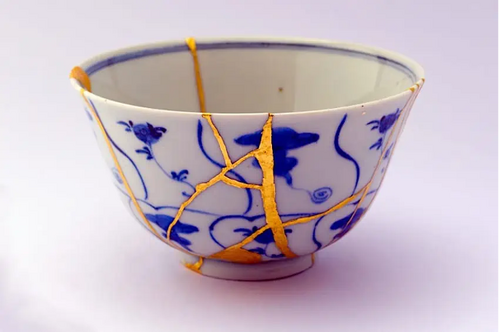 Now, in our Western World, when we talk about having “restored” an antique painting or a cracked vase, we mean that we have returned it to its original state, the goal being to fully eradicate any signs of damage or imperfections. But the Japanese have an ancient artistic practice called “Kintsugi” with the exact opposite aim. Instead of being hidden, in Kintsugi art, the broken parts of an object are actually highlighted so that they become more noticeable. Wikipedia says of Kintsugi: